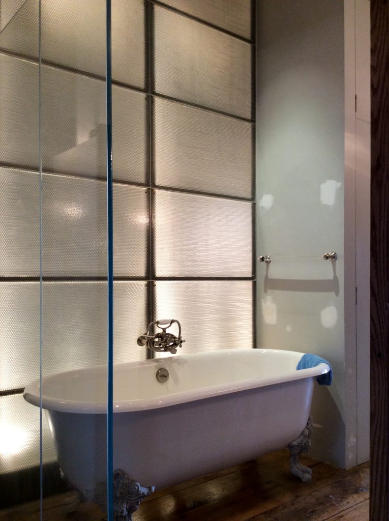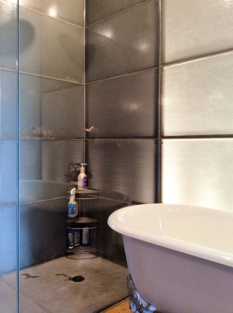 This industrial loft on West Street took the look to every space in the home, including the bathroom. With tiles that accent the sliding brushed-steel bathroom door, the step-in shower features a rain showerhead suspended from above, evoking a machine-shop vibe. A glass partition provides separation without making the small space feel cramped, and an adjacent soaking tub adds a touch of luxury. The polished concrete floor in the shower melds perfectly with the distressed wood floor in the rest of the bathroom.
