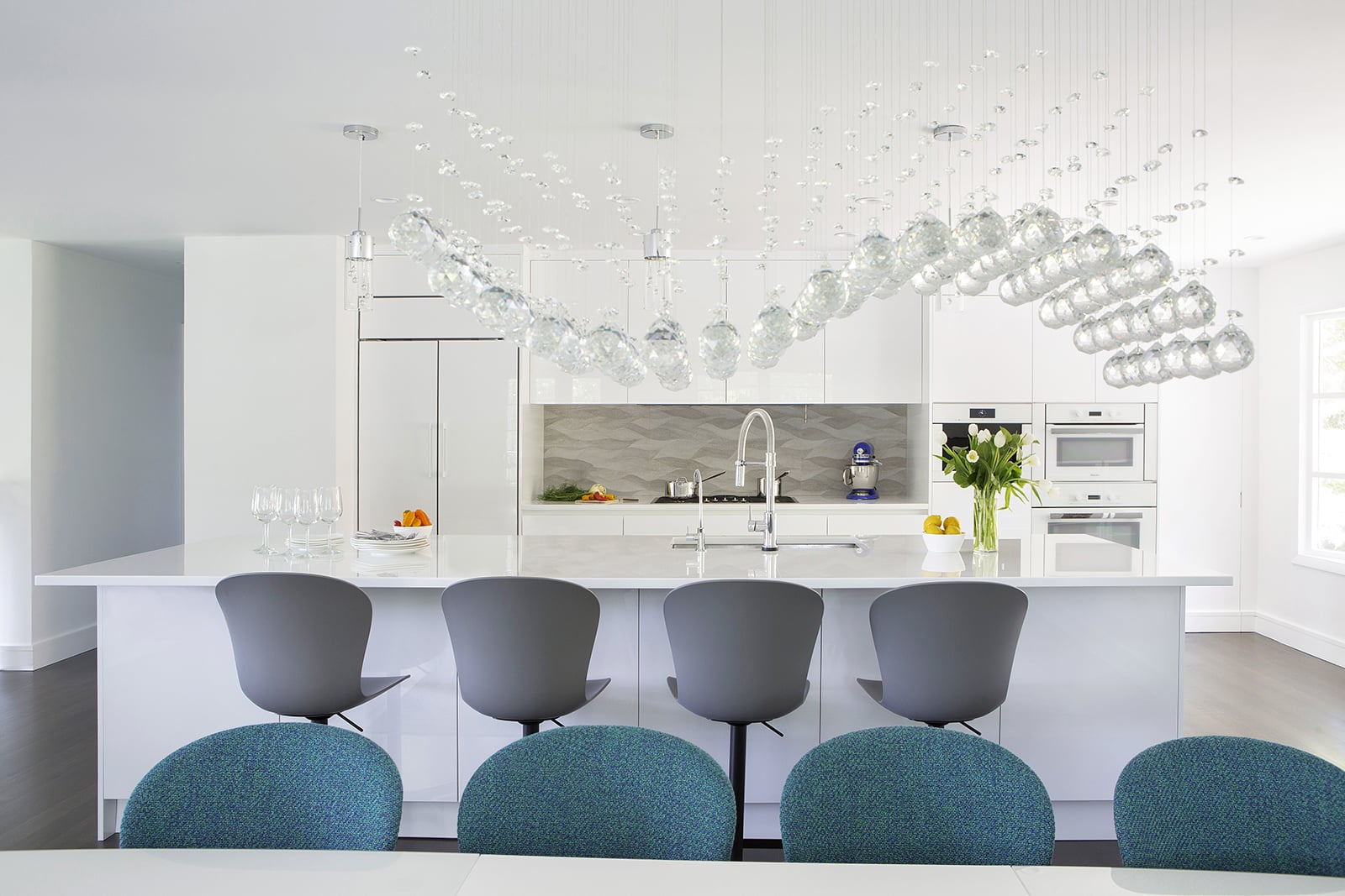 The electrical system was also upgraded to provide additional lighting and to accommodate a spectacular fixture above the dining table. Almost invisible when seen from one angle, the crystal-clear spheres make the same wave pattern as the backsplash when viewed from the dining area. Recessed can lights and subtle pendants above the island provide ample light without being obtrusive fixtures in the airy kitchen.